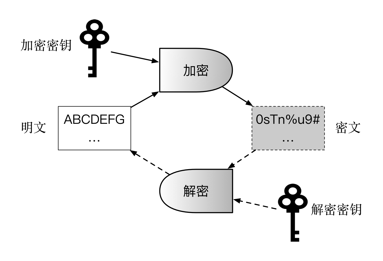 加解密的典型过程如下图所示。加密过程中,通过加密算法和加密密钥,对明文进行加密,获得密文;解密过程中,通过解密算法和解密密钥,对密文进行解密,获得明文。